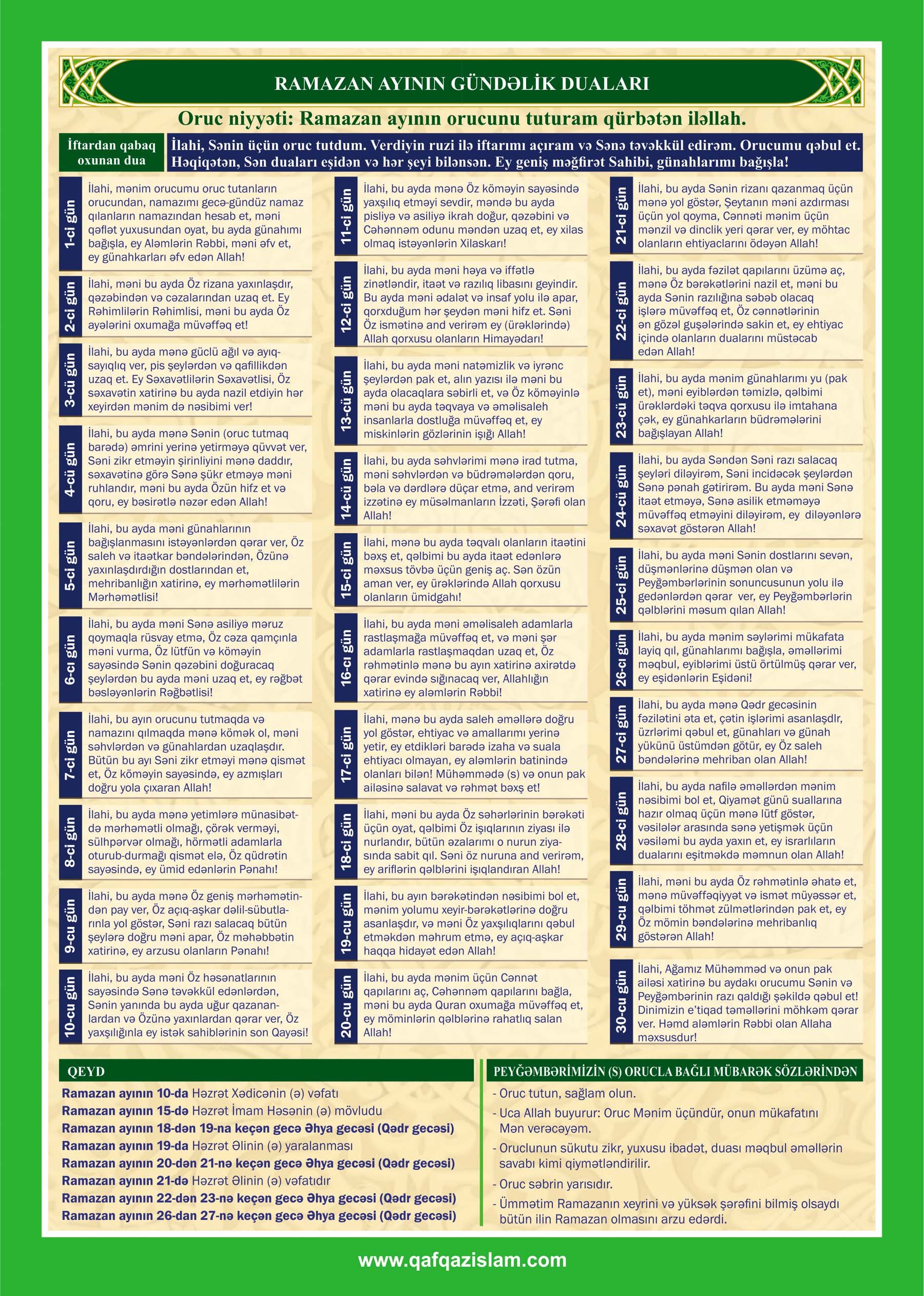 Qafqaz Müsəlmanları İdarəsindən (QMİ) verilən məlumata görə, təqvimdə Ramazan ayının namaz vaxtları, imsak və iftar vaxtları əks olunub.