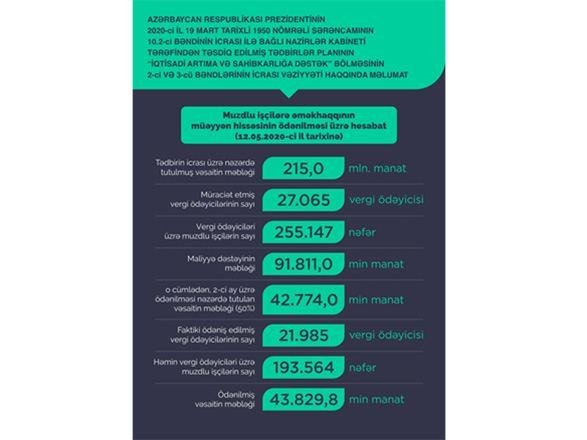 Azərbaycan Respublikası Prezidentinin 2020-ci il 19 mart tarixli Sərəncamının 10.2-ci bəndinin icrası ilə bağlı Nazirlər Kabineti tərəfindən təsdiq edilmiş Tədbirlər Planına əsasən, 12 may tarixinə İqtisadiyyat Nazirliyinə muzdlu işçilərin əməkhaqqının müəyyən hissəsinin ödənilməsi üçün koronavirus (COVİD-19) pandemiyasından zərər çəkmiş 27.065 vergi ödəyicisi və maliyyə dəstəyi almaq üçün 103.268 fərdi (mikro) sahibkar, cəmi 130.333 vergi ödəyicisi müraciət edib.