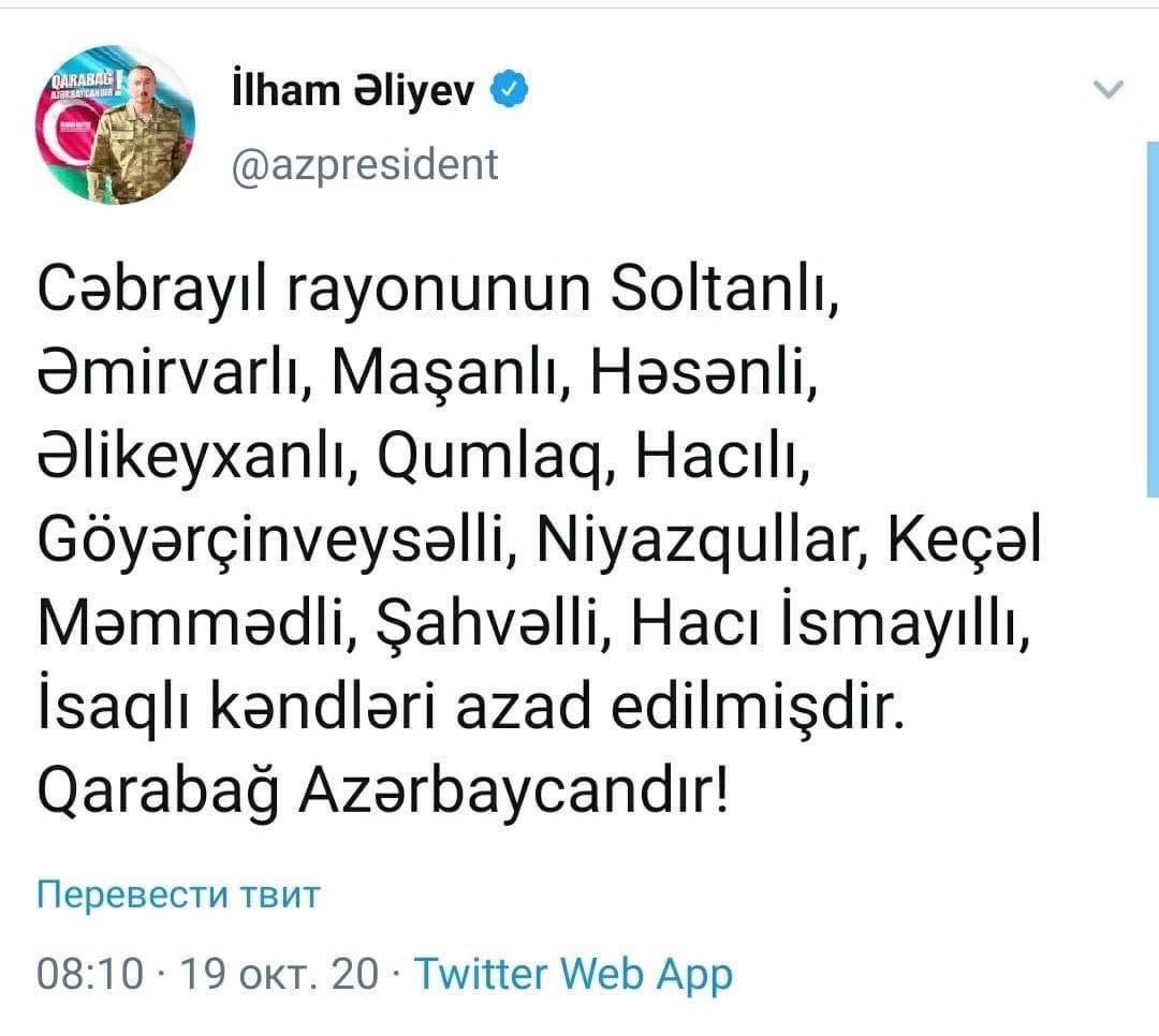 "Cəbrayıl rayonunun Soltanlı, Əmirvarlı, Maşanlı, Həsənli, Əlikeyxanlı, Qumlaq, Hacılı, Göyərçinveysəlli, Niyazqullar, Keçəl Məmmədli, Şahvəlli, Hacı İsmayıllı, İsaqlı kəndləri azad edilmişdir. Qarabağ Azərbaycandır!".
