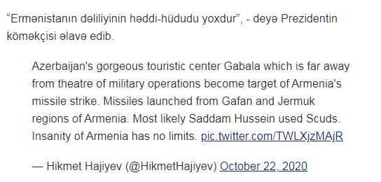 “Azərbaycanın möhtəşəm turizm mərkəzi sayılan və hərbi əməliyyatlar bölgəsindən çox uzaq olan Qəbələ şəhəri Ermənistanın raket zərbəsinin hədəfinə çevrilib”.