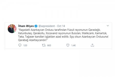 "Müzəffər Azərbaycan ordusu Cəbrayıl rayonunun Xudaverdili,Qurbantəpə,Şahvələdli,Xubyarlı,Zəngilan rayonunun Aladin,Vecnəli,Qubadlı rayonunun Kavdadıq,Məmər,Mollalı kəndlərini işğaldan azad etmişdir. Eşq olsun Azərbaycan ordusuna! Qarabağ Azərbaycandır!"