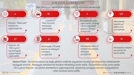 dogruxeber.tv: - Dövlət başçısının tapşırıqlarına uyğun olaraq 2021-ci ildə Bakı şəhərində yol infrastrukturunun təkmilləşdirilməsi istiqamətində mühüm layihələr icra edilib. Görülən işlər sayəsində hərəkət iştirakçılarının təhlükəsizlik səviyyəsi əhəmiyyətli dərəcədə artırılıb. Nəqliyyat vasitələrinin hərəkət növbəliliyi təmin edilib. Ümumilikdə isə son 6-ildə 70-ə yaxın küçə və prospektdə səkilər standartlara uyğunlaşdırılıb, əlçatanlıq səviyyəsi yüksəldilib və piyadaların rahat hərəkəti təmin edilib.