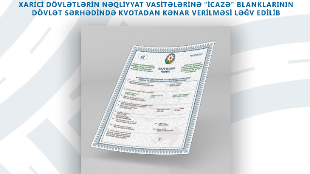 Azərbaycan Respublikası Prezidentinin 29 mart 2023-cü il tarixli Fərmanı ilə xarici dövlətlərdə qeydiyyatda olan nəqliyyat vasitələrinə “İcazə” blanklarının dövlət sərhədinin buraxılış məntəqələrində verilməsi ləğv edilib.