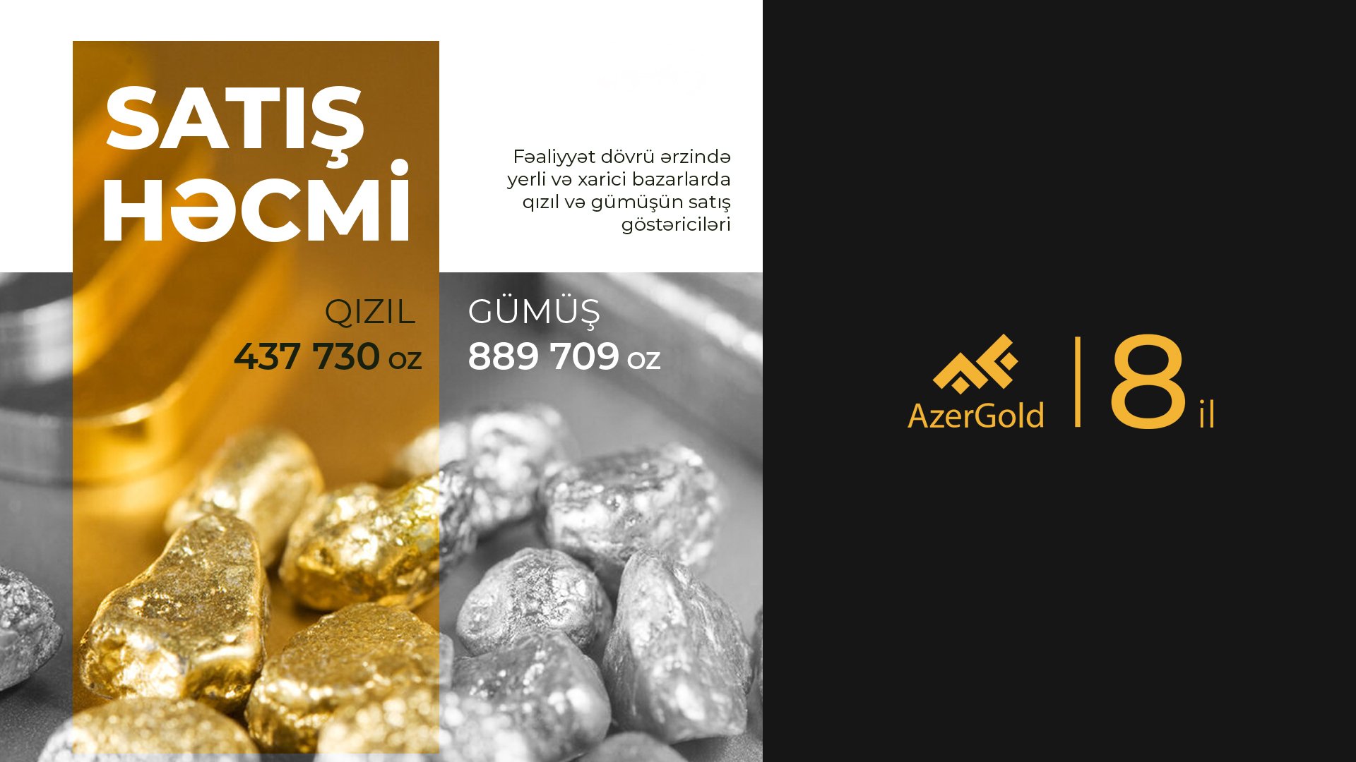 "dogruxeber.tv" qeysd edir ki, ötən 8 il ərzində “AzerGold” QSC qeyri-neft-qaz sektoru üzrə ixracatçı dövlət subyektləri sırasında ön pillələrdə qərarlaşmağa nail olub. Səhmdar Cəmiyyət 441,326 unsiya qızıl, 919,244 unsiya gümüşün hasilatı, 437,730 unsiya qızıl, 889,709 unsiya qızıl və gümüşün yerli və beynəlxalq bazarlarda satışını həyata keçirib. Bu satış əməliyyatları nəticəsində ölkə iqtisadiyyatına 1,274,094,914 manat vəsait cəlb edilib.