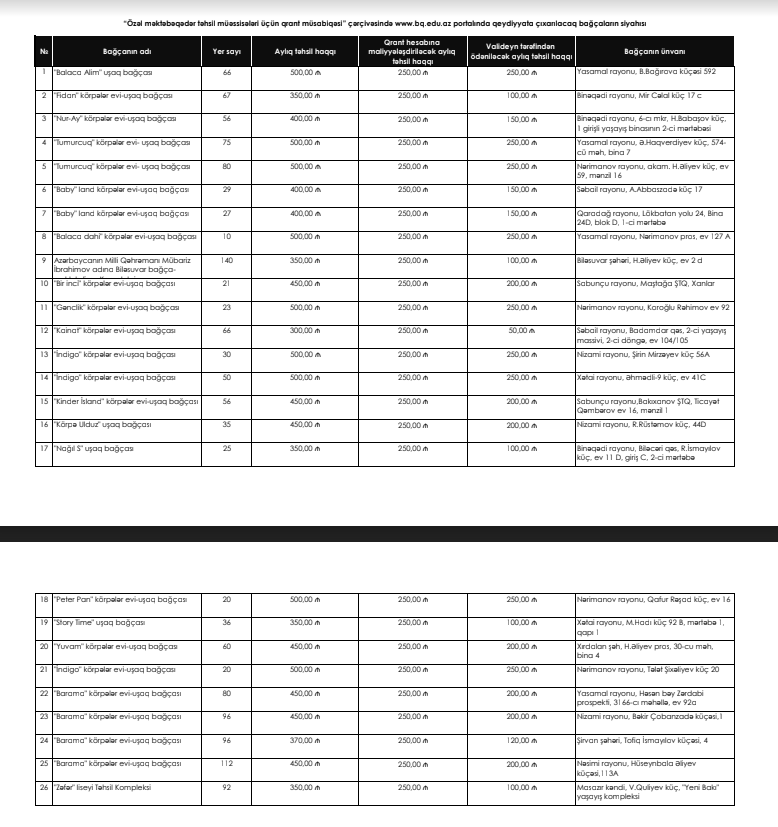 Elm və Təhsil Nazirliyi tərəfindən elan olunan “Özəl məktəbəqədər təhsil müəssisələri üçün qrant müsabiqəsi”nin birinci mərhələsi yekunlaşıb. Müsabiqə çərçivəsində növbəti mərhələyə buraxılan bağçaların siyahısı və həmin bağçalarda boş yerlərin sayı müəyyənləşdirilib.