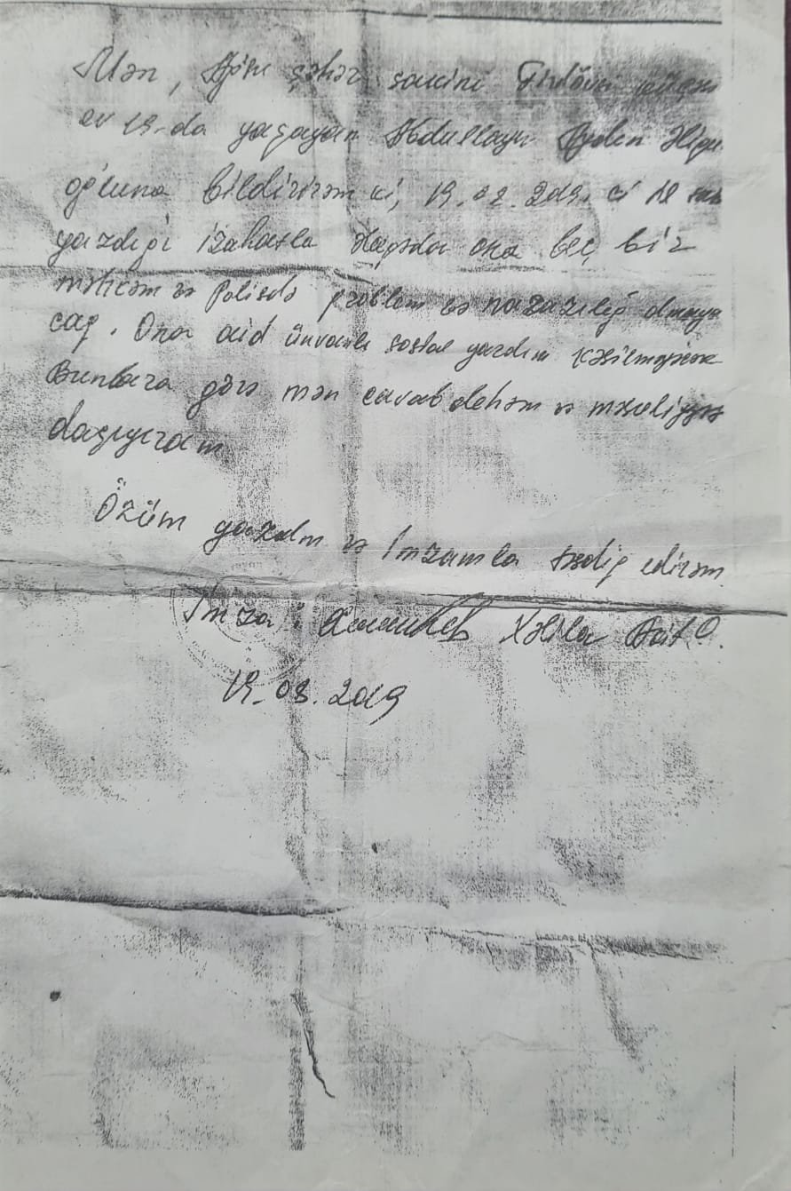 Lakin məsələ bununla məhdudlaşmır. Qorxmaz Abdullayevin təqdim etdiyi digər sənəd isə vəziyyətin daha ciddi və ziddiyyətli olduğunu göstərir. Belə ki, onun sözlərinə görə, Ağsu filialının rəhbəri Akif Xəlilov tərəfindən Abdullayev Aydın Əliqulu oğluna 19 avqust 2019-cu il tarixində rəsmi, möhürlü və imzalı yazılı sənəd təqdim olunub. Həmin sənəddə qeyd edilir ki, Aydının sonuncu izahatından sonra ona qarşı nə hüquq-mühafizə orqanları, nə də digər qurumlar tərəfindən problem yaradılmayacaq və ən diqqətçəkən məqam kimi, ona təyin olunmuş ünvanlı sosial yardımın kəsilməyəcəyi bildirilir.