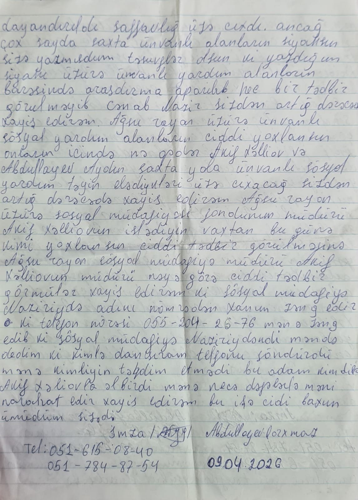 DogruXeber.tv xəbər verir ki, Vətəndaş öz müraciətində Ağsu Dövlət Sosial Müdafiə Fondunda idarəetmə ilə bağlı ciddi qanun pozuntularının olduğunu iddia edir. Onun sözlərinə görə, rayon üzrə ünvanlı sosial yardım alan şəxslərin bir qismi bu yardımın təyinat meyarlarına uyğun gəlmir. Qorxmaz Abdullayev konkret olaraq qeyd edir ki, siyahılarda adları olan bəzi şəxslər faktiki sosial vəziyyətlərinə görə bu yardımı almaq hüququna malik deyillər, lakin buna baxmayaraq illərlə sosial yardım alıblar.