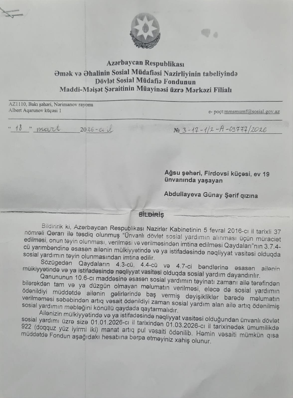 Təqdim olunan rəsmi bildirişə əsasən, Əmək və Əhalinin Sosial Müdafiəsi Nazirliyi tərəfindən aparılan yoxlama nəticəsində Abdullayeva Günay Şərif qızına təyin olunmuş sosial yardım dayandırılıb. Sənəddə qeyd olunur ki, ailənin vəziyyəti sosial yardımın verilməsi şərtlərinə uyğun olmadığı üçün qərar ləğv edilib və 01 yanvar 2026-cı ildən 01 mart 2026-cı ilədək olan dövr üzrə ödənilmiş 922 manat artıq vəsaitin dövlət büdcəsinə qaytarılması tələb olunur. Bu sənəd birbaşa olaraq Qorxmaz Abdullayevin müraciətindən sonra aparılan yoxlamanın nəticəsi kimi təqdim edilir.